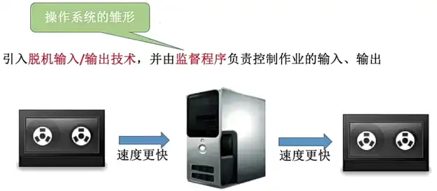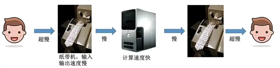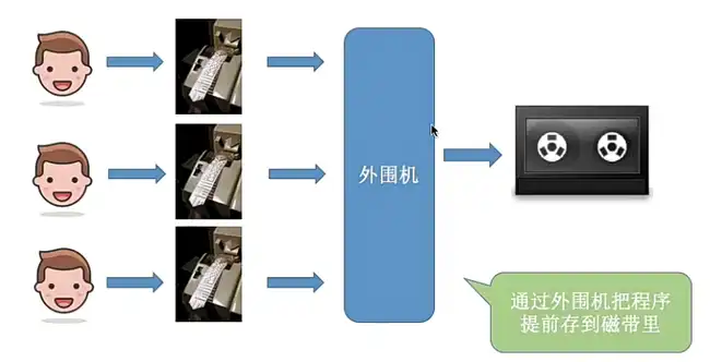 该阶段执行流程:程序将代码是提前写在了纸带机上,接着将它放入计算机,计算机读取指令执行得到结果后再次输出到纸带机上,最终程序员再通过手工方式取走。