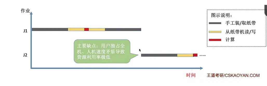 缺点:用户独占全机(同一时间只能处理用户传入的一个程序),实际就是之前提到的单核程序执行。