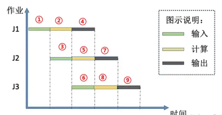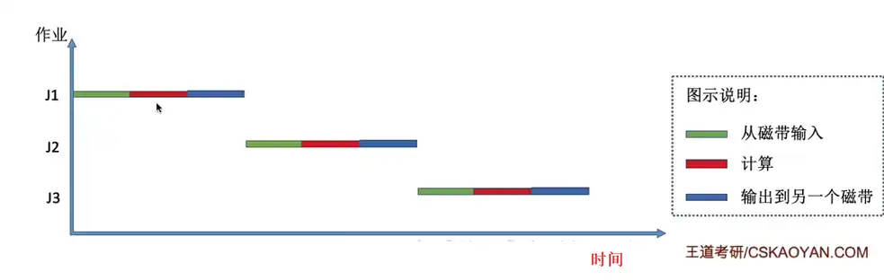 在这个阶段的机器造价极其昂贵,通过这种手动输入输出的方式,浪费了大量计算机的资源利用率,下图是整个过程中占用的时间开销,可以看到计算机处理占到了很小的一块: