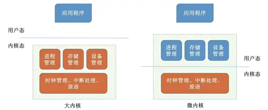 - 说明:各个模块之间,若是要使用一个功能管理部分的功能,就直接调用函数即可。这种方式可以使得功能的调用效率非常高。在微内核中就需要使用消息出传递的方式来调用其他模块所提供的功能。