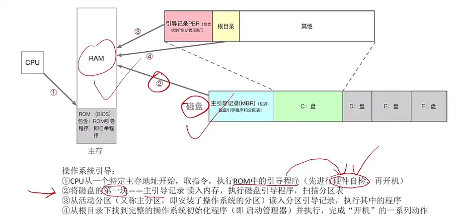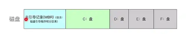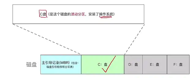 - 此时 CPU 就会执行这个主存里边的磁盘引导程序,对于磁盘引导程序则会根据分区表去判断 C 盘所处的位置接下来是否可以读入 C 盘的第一部分数据,也就是读取 C 盘中的引导记录 PBR(该引导程序本质依旧是一个程序)。
