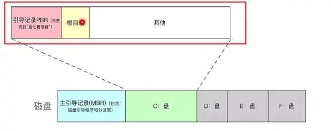 此时再将 C 盘进行细分:包含引导记录 PBR、根目录、其他