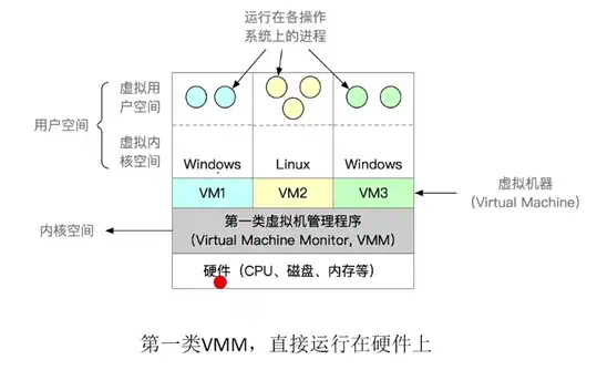 运行模式:第一类 VMM 运行在 Ring 0(0 环,最高级别),上层系统运行在次高优先级;第二类 VMM 部分运行在用户态,部分运行在内核态,对于虚拟机中发出的系统调用会被 VMM 截获再转化为 VMM 对 Host OS(宿主机)的系统调用,对于虚拟机管理程序则一直会被当成一个工具人使用。