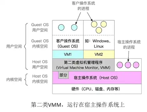 重点:第二类的虚拟机管理程序并不是运行在硬件之上,而是运行在宿主机操作系统上,在第二类中若是想要给虚拟机器分配硬件资源,那么只能够请求操作系统给它分配(管理者),对于这一类宿主机操作系统是在核心态运行的,第二类虚拟机管理程序则是在用户态运行(部分是在内核态)。