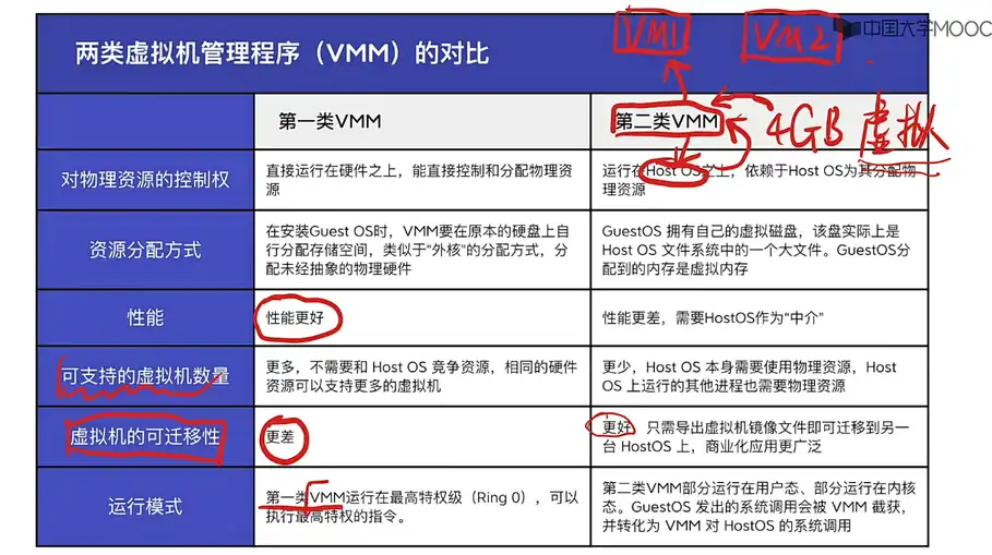 两类虚拟机管理程序(VMM)的对比如下所示: