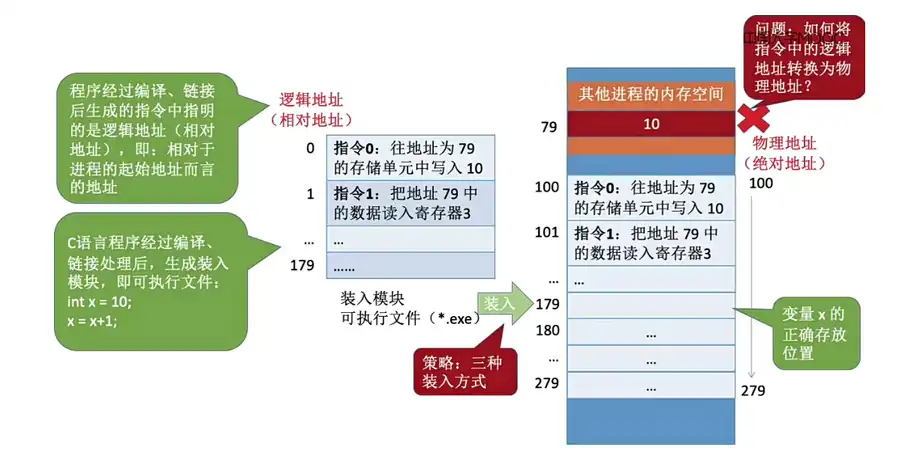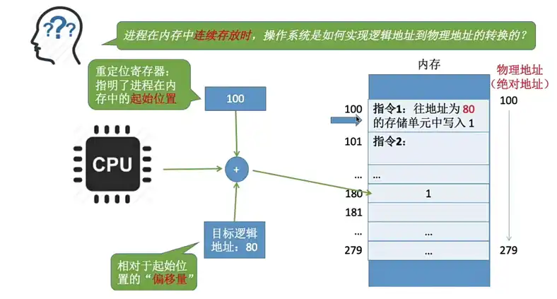 实际指令中给出的地址实际是相对地址(逻辑地址),这个地址指的是它相对于这个进程的起始地址而言的地址,有些时候并不是直接从 开始的地址,如下面往地址 79 存储单元写入 10,而实际的程序中初始地址是从 100 开始的,那么在这里这个逻辑地址就需要去根据相对这个程序的初始地址来得到真实的物理地址: