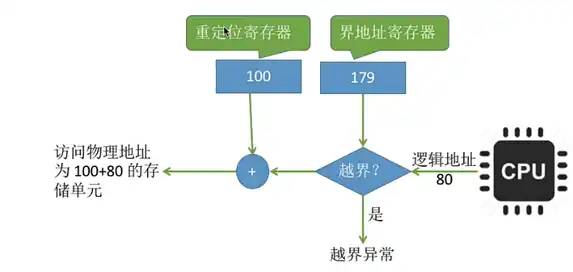 流程:比较的逻辑如上图所示,首先看 80 是否 < 179,小于表示是在范围内,接着去用重定位寄存器加上逻辑地址得到最终的存储单元地址。