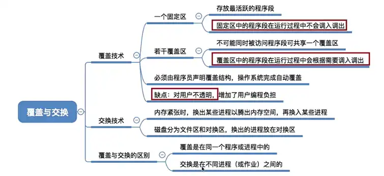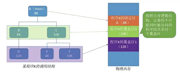 覆盖技术思想:将程序分为多个段 (多个模块)。常用的段常驻内存,不常用的段需要时调入内存。