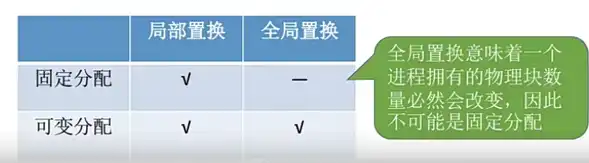 • 局部置换:发生缺页时只能选进程自己的物理块进行置换。