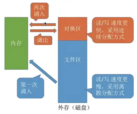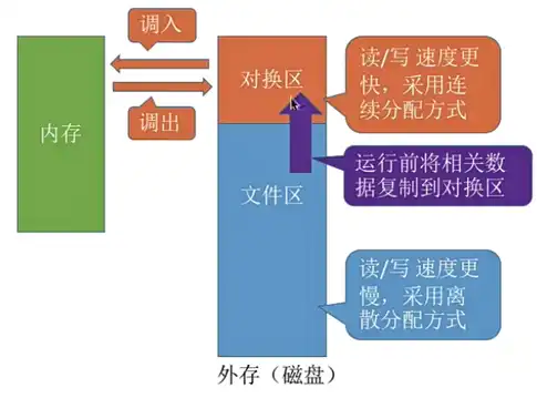 • 系统会在运行前将相关数据复制到对换区,之后将这些页面从对换区调出到内存;若是内存不够则会将内存中的某些页面调出到对换区当中。