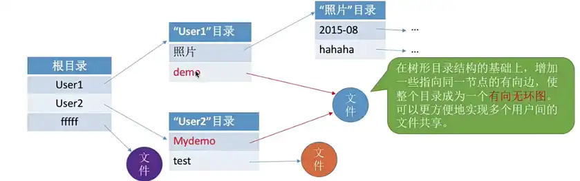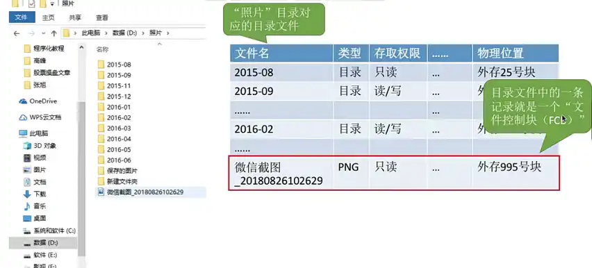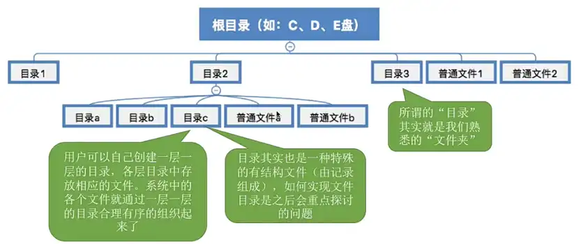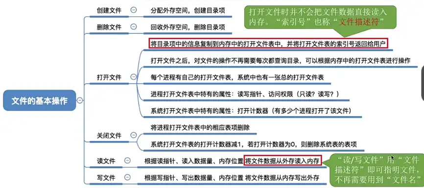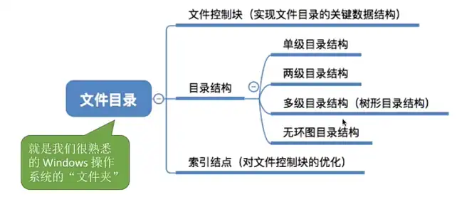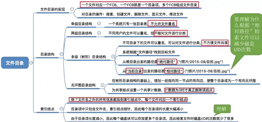 文件目录系统【文件目录章节】:用户是通过文件路径来访问文件的,因此这一层需要根据用户给出的文件路径找到相应的 FCB 或索引结点。所有和目录、目录项相关的管理工作都是在本层完成,例如:管理活跃的文件目录表、管理打开文件等。