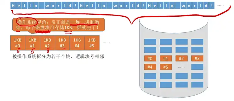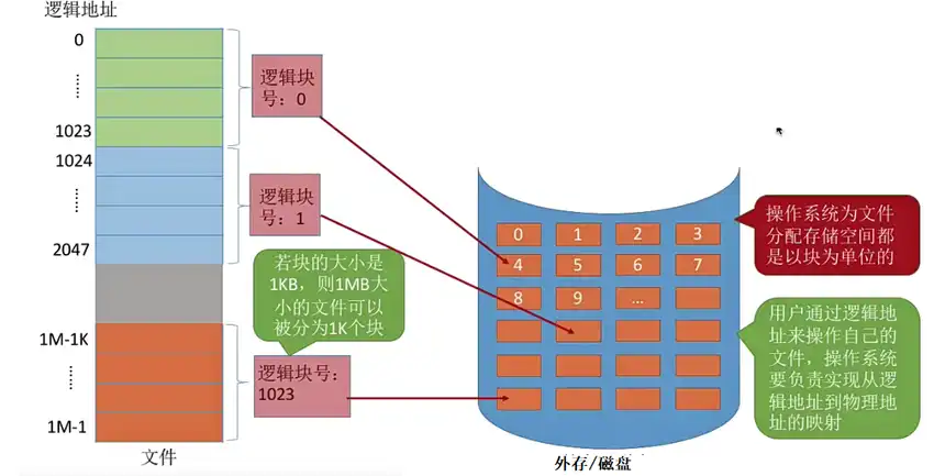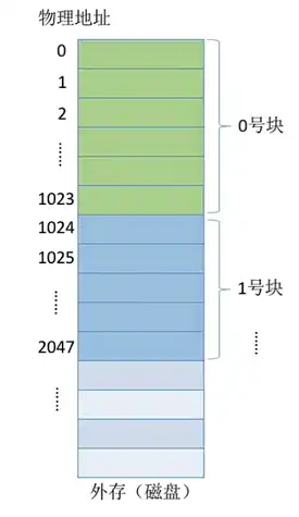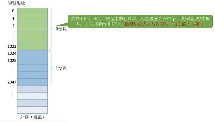 • 这里外存的块实际上类似于内存分为一个个 “内存块”,外存会分为一个个 “块 / 磁盘块 / 物理块”。每个磁盘块的大小是相等的,每块一般包含 2 的整数个幂地址,在下图中一个块就是 210 个地址,也就是 1KB。