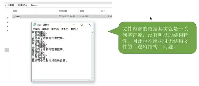 无结构文件:如文本文件,由一些二进制或字符流组成,又称 “流式文件”。