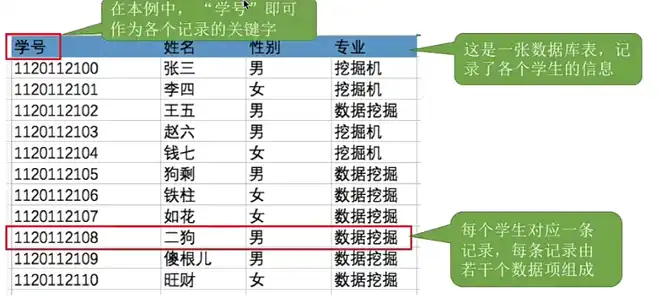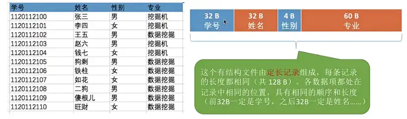 有结构文件:由一组相似的记录组成,又称 “记录式文件”。每条记录由若干个数据项组成。如:数据库表,每条记录有一个数据项可作为关键字,例如下图中的学号可以识别不同记录的 ID。