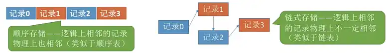 • 链式存储:类似于链表,逻辑上相邻,物理地址不相邻。
