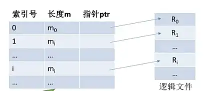 解决方案:我们可以设计一张索引表,在索引表中我们维护一个索引号,来实现快速检索长度 m 指的是指向逻辑文件对应记录的长度,还有一个字段是指针 ptr 用于指向对应的逻辑文件