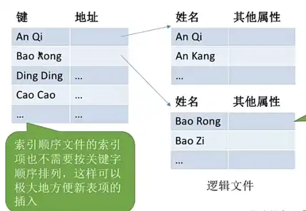 索引顺序文件:是索引文件和顺序文件思想的结合。在索引顺序表中,同样会为文件建立一张索引表,但不同的是并不是每个记录对应一个索引表项,而是一组记录对应一个索引表项。