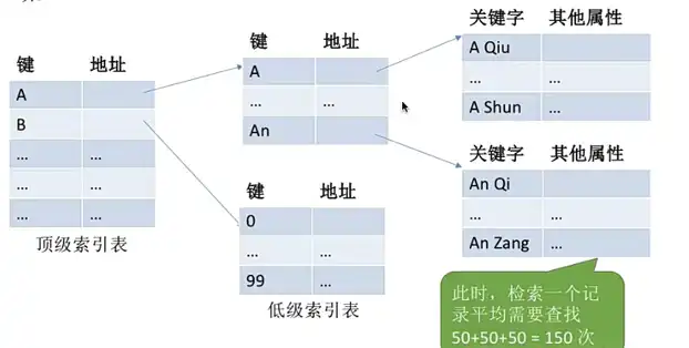 其他非单独创建索引表使用索引号作为关键字的设计:可以采用不同数据项合并来建立多个索引表。例如,学生表中可以用关键字 “学号” 建立一张索引表,或者姓名建立一个索引表(不太建议会重名)快速的检索文件了。
