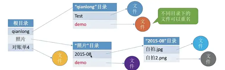 • 根目录:任何一个文件系统都必须从根目录出发来建立下一级的目录或者存储新的文件。