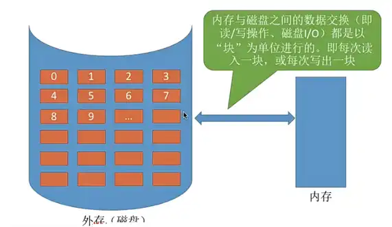 外存被分为一个个磁盘块,操作系统是以 “块” 为单位为文件分配存储空间,因此即使一个文件大小只有 10B,但它依然需要占用 1KB 的磁盘块,外存中的数据读入内存时同样以来作为单位。