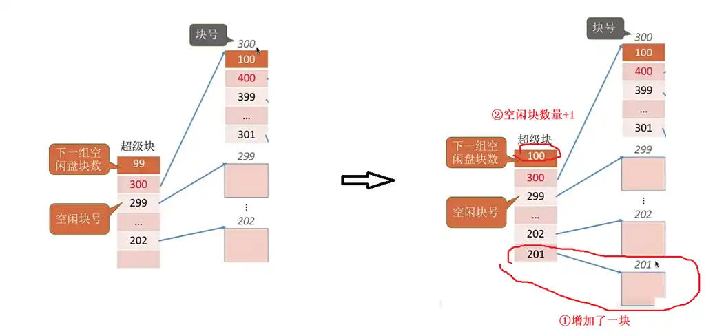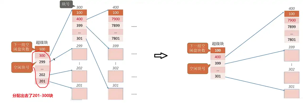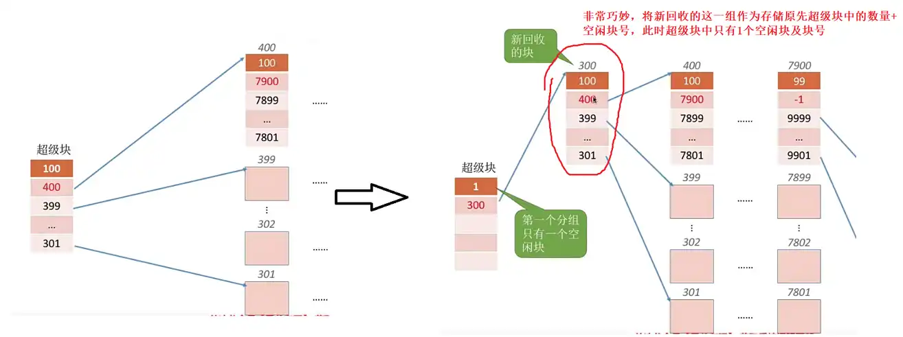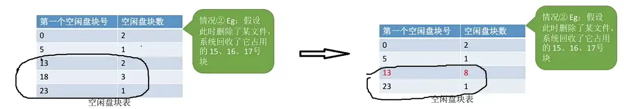 7. 删除这些记录后,会有一些盘块空闲,因此要将这些空闲盘块回收【辅助分配模块】。