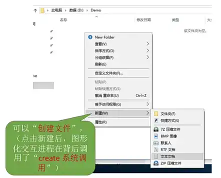 ①create 系统调用:当我们在文件管理器中右击—新建 - 文件夹时,实际上时图形化交互进程在背后调用了 “create 系统调用”。