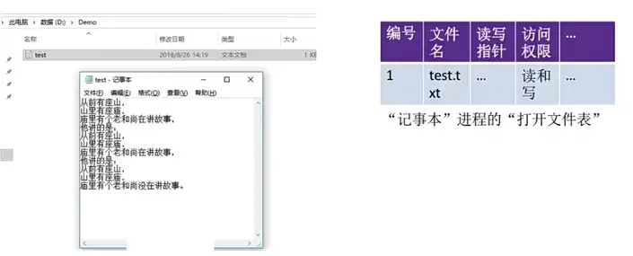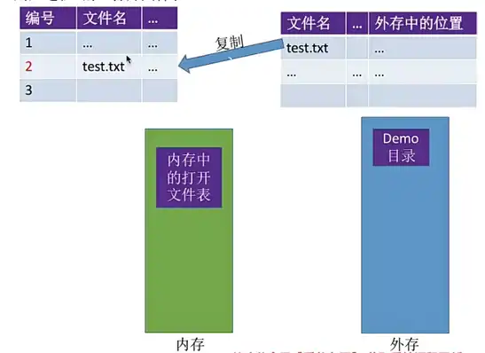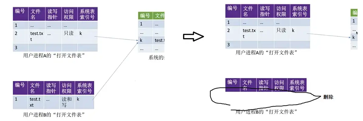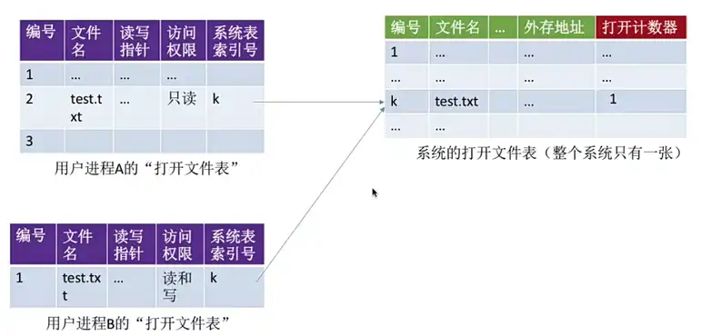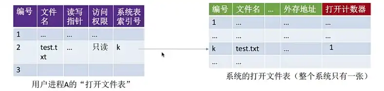 • 用户进程打开文件表:一个进程一张。记录中包含了进程打开了哪些文件。