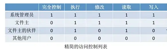 精简访问列表:以 “组” 为单位,标记各 “组” 用户可以对文件执行哪些操作。