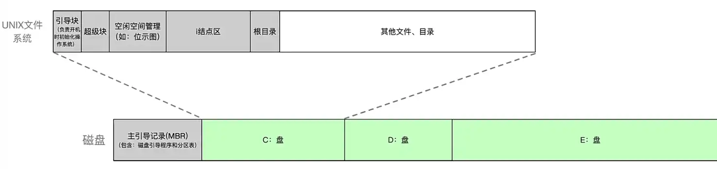 在每一个分区中可以建立各自独立的文件系统,例如在 C 盘分区中,建立了一个 unix 的文件系统,对应的 unix 文件系统结构如下