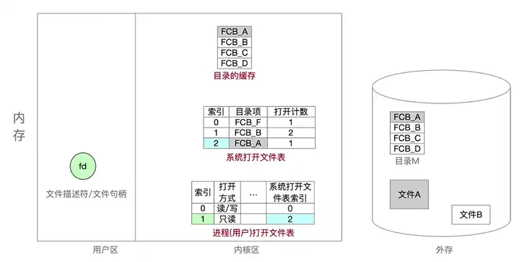 上面调用 open 函数后得到的 fd 文件描述符就是对应内核区中的进程打开文件表,进而又通过打开文件表索引找到对应的系统打开文件表的目录项,最终确定文件的物理地址来进行访问外存读取数据。【过程只有一次磁盘访问 I/O】