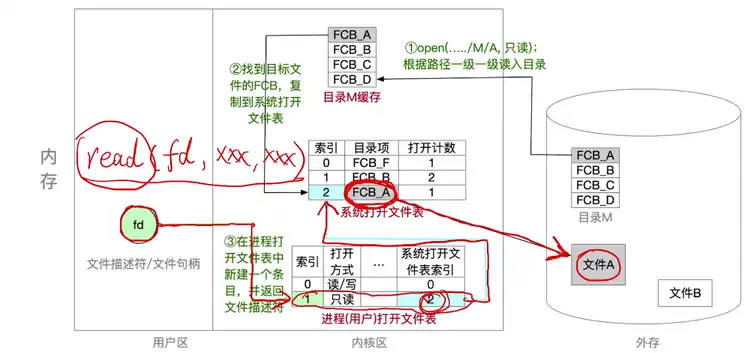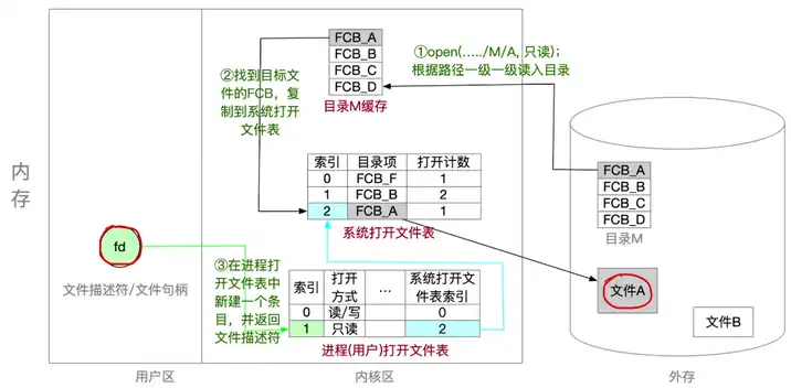 1. 调用 open 函数时,首先回去外存文件目录 A 中读入目录到目录 M 缓存。