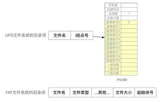 可以看到不同的文件系统表示的目录项各不相同,UFS 文件系统的时inode,FAT 文件系统的目录项则是包含多种字段的:
