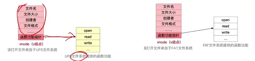 包含这样的一个函数功能指针的好处:只要我们 open 打开了一个文件,那之后文件进行任何操作如 read、write 都可以先找到这个文件的 vnode 接着根据器记录的这个函数功能指针,再找到相对应文件系统的函数功能列表,执行具体的函数。