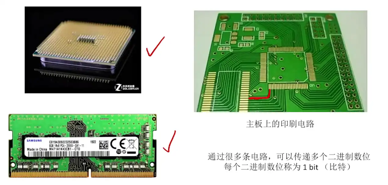 • 主板上的印刷电路如何传输数据:可以看到有多个电路,这个就是各个部件之间传输电路的通道。