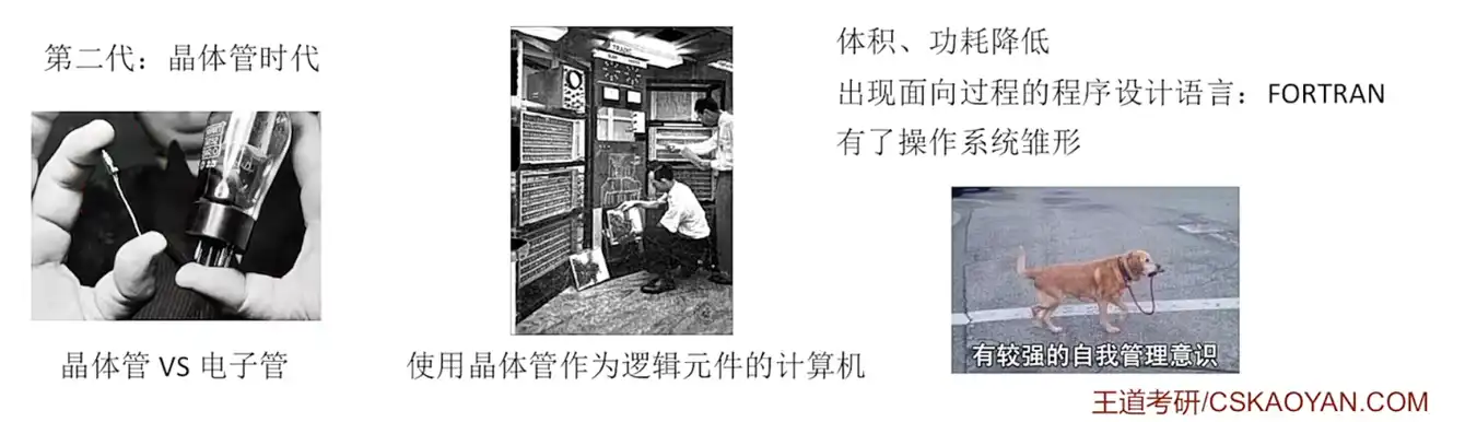 体积减小、功耗降低,计算速度也达到了质的飞跃,此时出现面向过程的语言:FORTRAN,有了操作系统雏形。