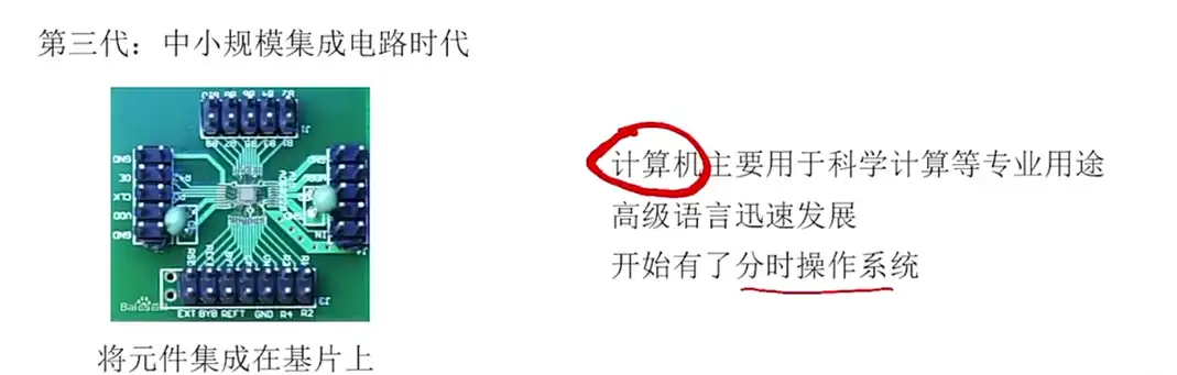计算机变得越来越小,功耗变低,集成电路比手动焊接的晶体管的可靠性更好,此时高级语言迅速发展,此时有了分时操作系统。