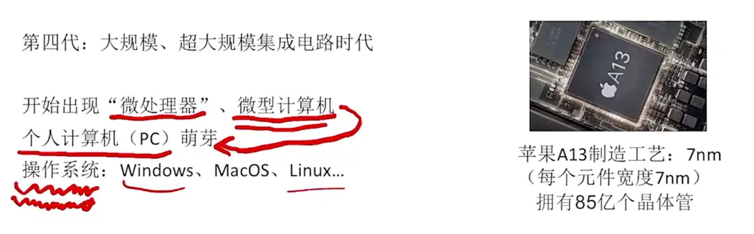 随着集成电路的提升,出现第四代,此时开始出现微处理器,也就是 CPU,例如苹果的 A13。