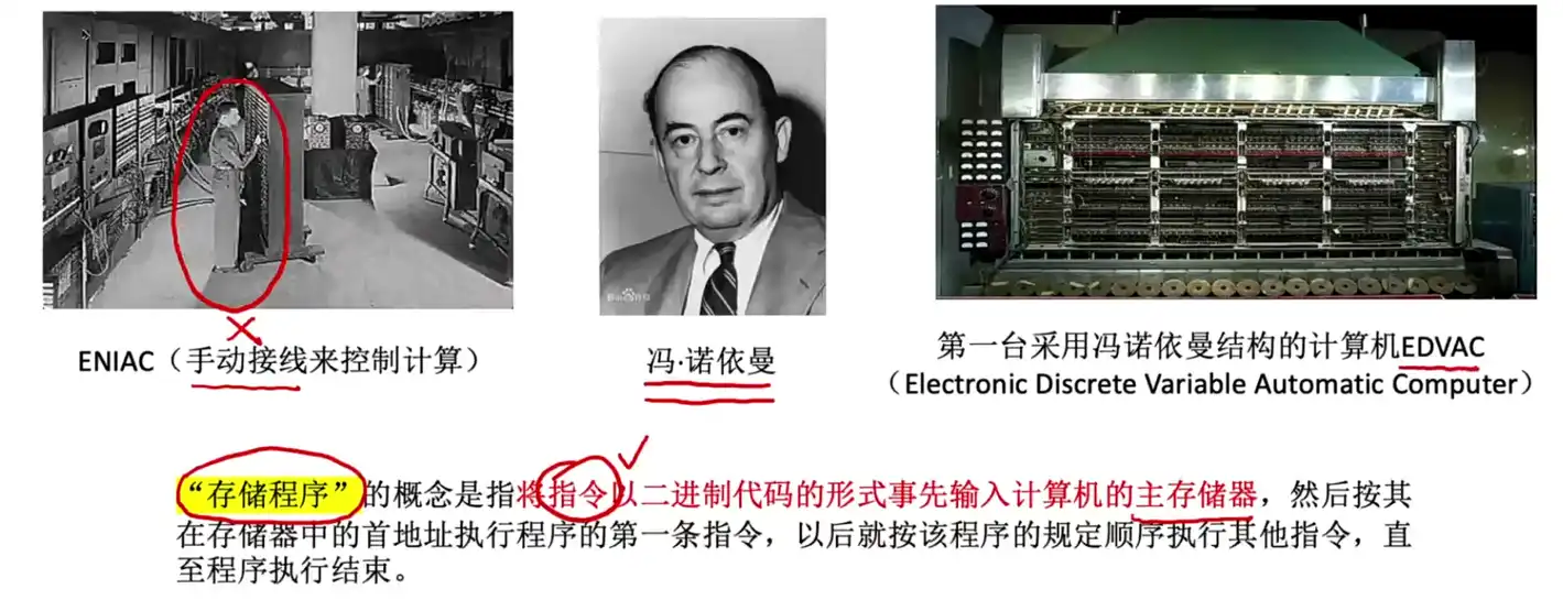 而冯诺依曼提出了存储程序的概念,提前可以将二进制代码输入计算机的主存储器,之后按照存储器的首地址执行程序的第一条指令,接着就往后执行其他指令直到结束。