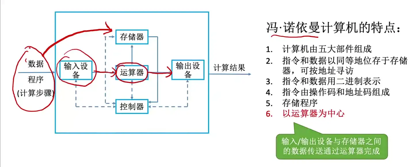 2.1.1、冯诺依曼基本思想及特点(以运算器为中心,包含五大部件)
