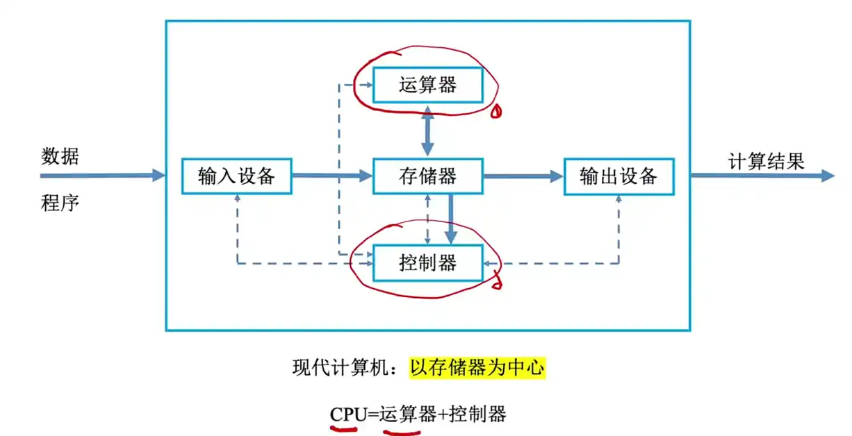 优化之前冯诺依曼以运算器为核心的架构,现代计算机的机构是以存储器为核心,如下图: