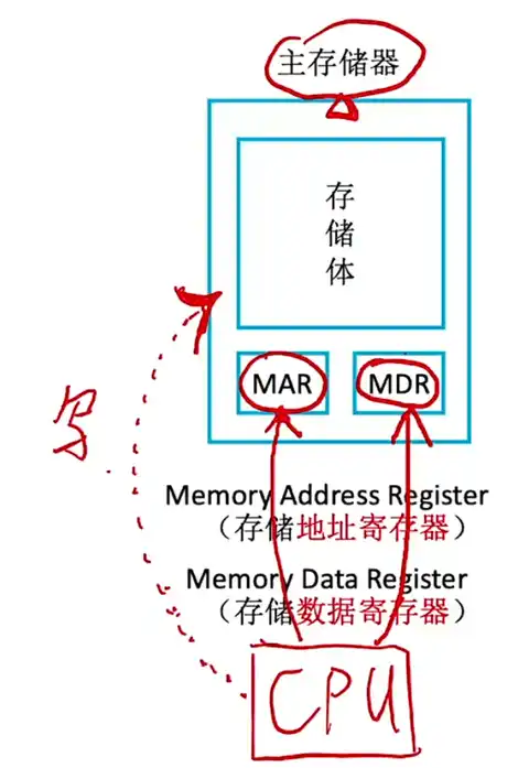 对于存储器来说,CPU 可以指明要写入到哪个位置 (放入到 MAR),写入的哪个数据 (放入到 MDR),最后 CPU 会通过控制总线告诉主存储器说这次要进行的操作是写操作,那么主存储器根据 CPU 发出的这三个信息,就可以往对应的位置写入 CPU 想要写的数据了。