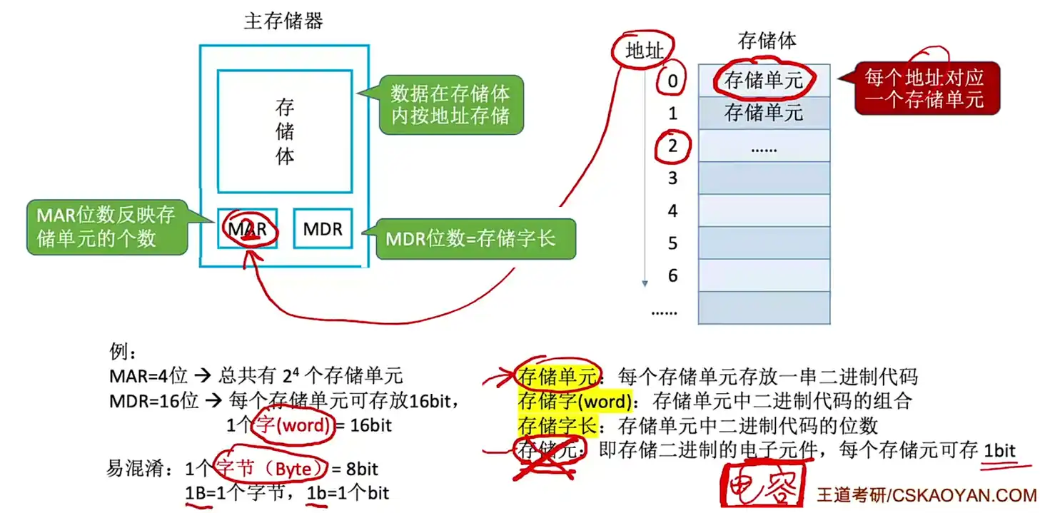 • 一个字的大小要看主存储器的计算机硬件如何设计,有 8、16、32 位的。不要将其和 1 个字节混淆,还有 1B、1b。