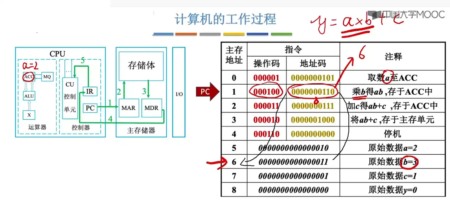 第三条指令执行完成后,执行主存地址为 3 的指令:实际就是将之前的y=a*b+c=2*3+1=7存储到指定 0000000000000111 地址空间中