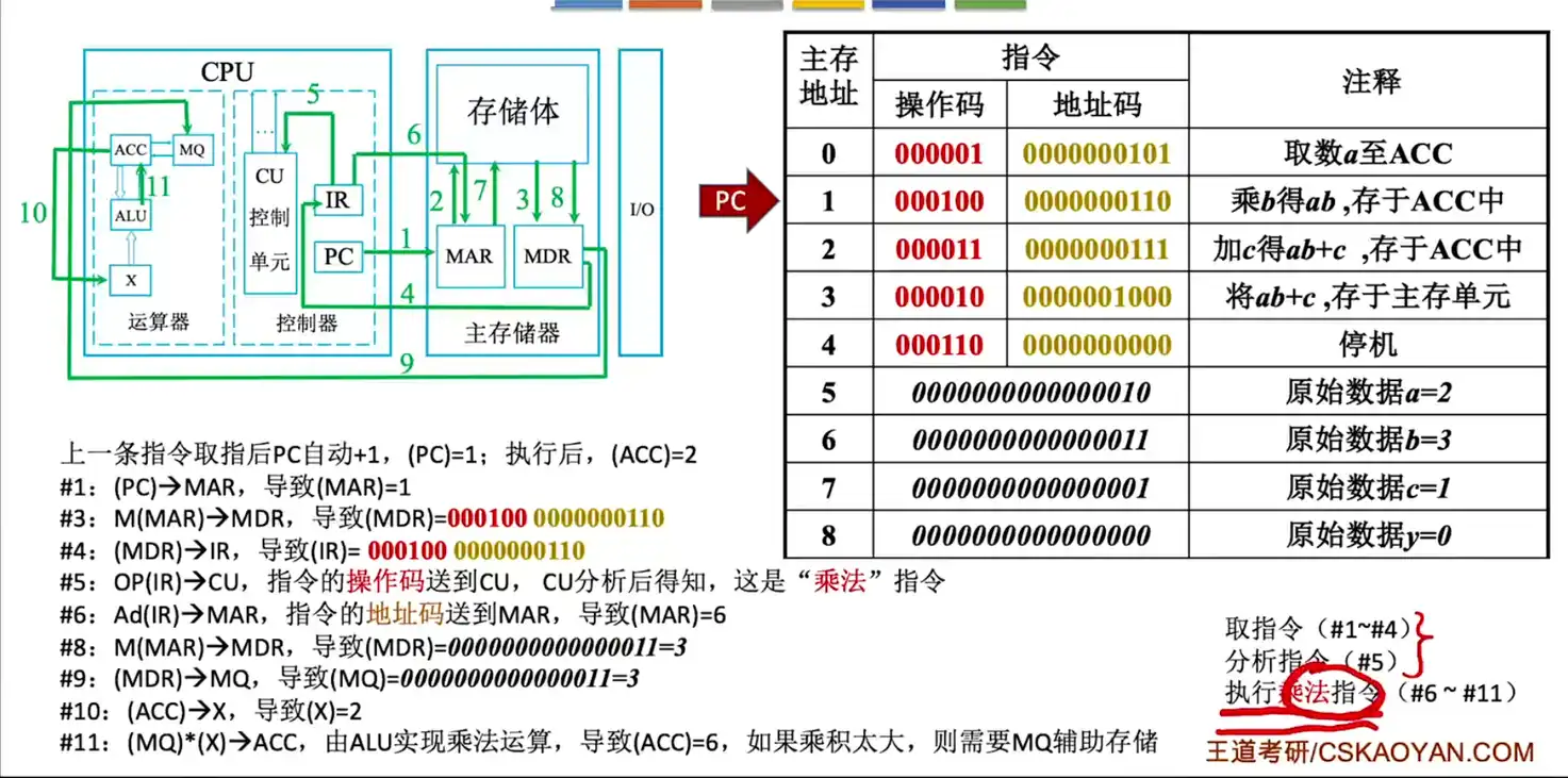接下来执行第二条指令:很明显中间过程也是让 CU 去处理识别操作码 000100,即为乘法指令,对应的地址码指定主存地址为 6 的