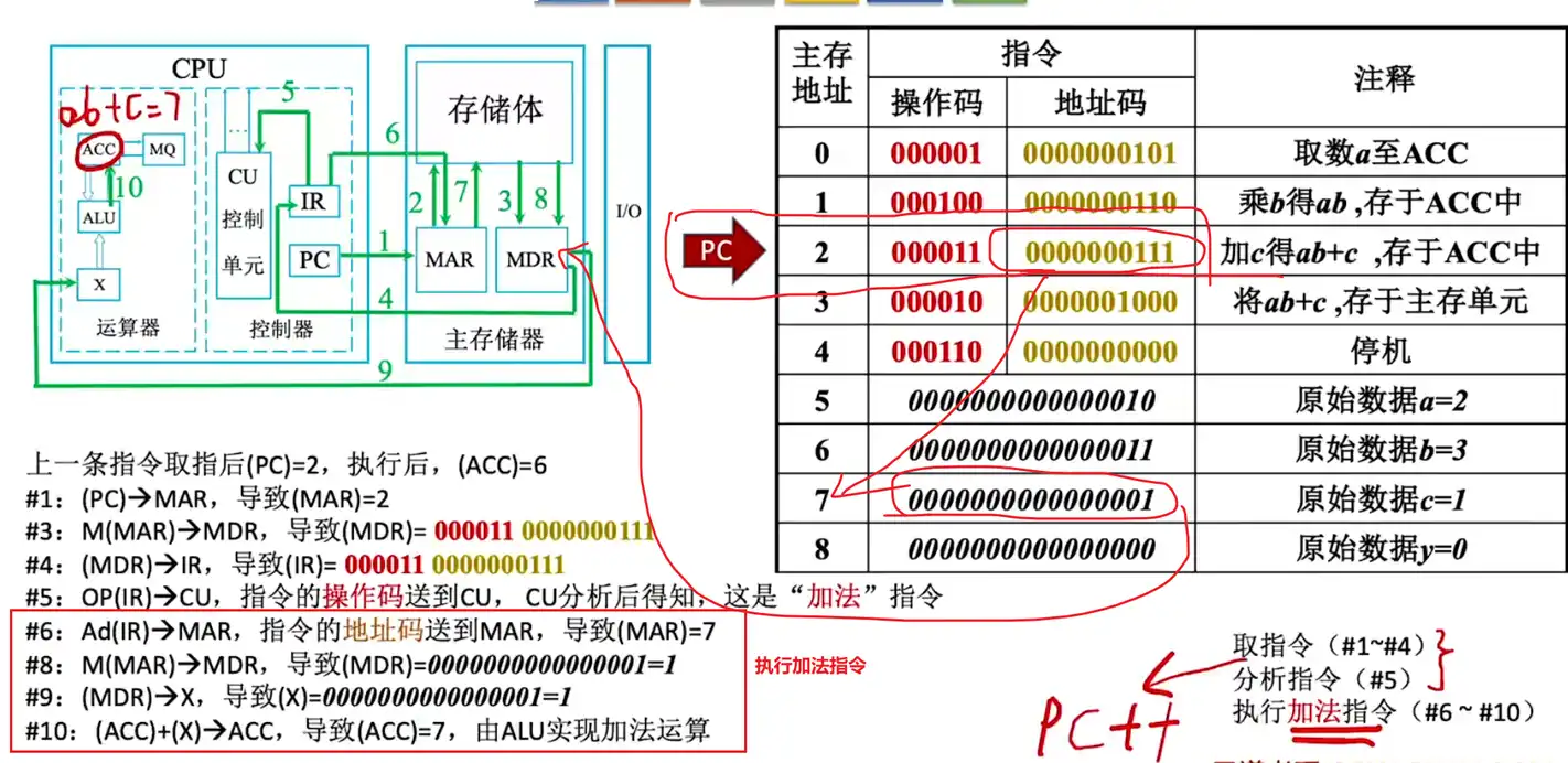 上面第二条指令执行完毕之后,PC 同样会加 1,此时开始执行主存地址为 2 的 PC 指令: