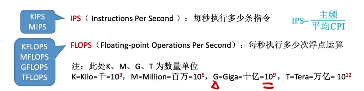 • 例如:2MIPS 表示每秒钟 2 百万条指令。2GIPS 表示每秒二十亿条指令。
