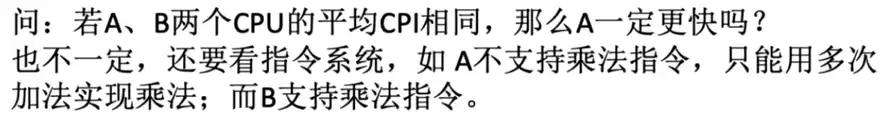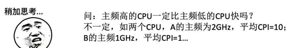 ** 问 1:主频高 CPU 一定比主频低 CPU 快?** 并不是,若是 CPI 快,后者可能执行的指令也很快!