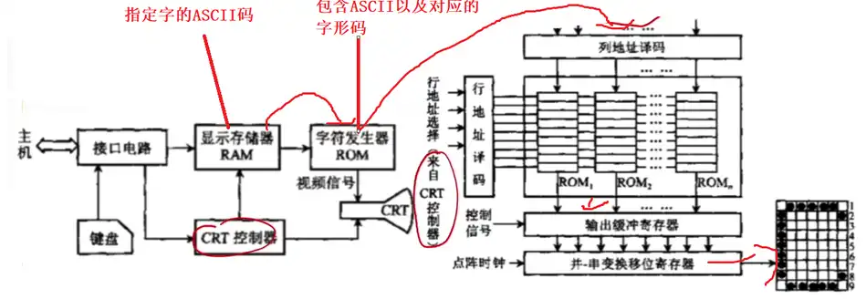 2. 接着在在阴极射线管控制器的控制下,显存里的这些字符会发送给字符发生器 ROM 中,在这个字符发生器内部不仅仅有控制电路外,还有对应的 ROM 来存放每一个 ASCII 对应的字形码,也就是对应的点阵信息,接着根据这个指定字符 ASCII 码和 CRT 的控制信号选中某一个字符的字形码所存储的 ROM 单元(指定最终显示的字)。