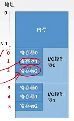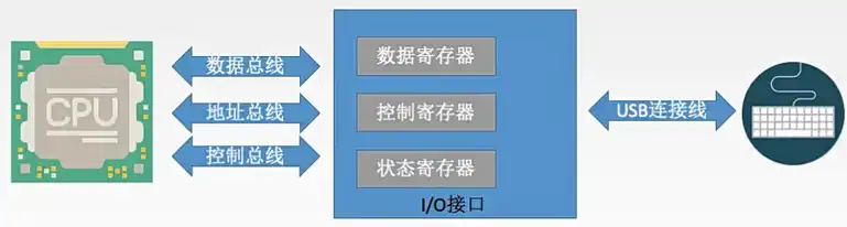 • CPU 会通过控制总线向这个 I/O 接口发出读的命令,同时通过地址总线指明要读的设备,其中地址线还指明了设备读入的寄存器(指向数据寄存器),此时我们输入的数据都会存储在数据寄存器当中。