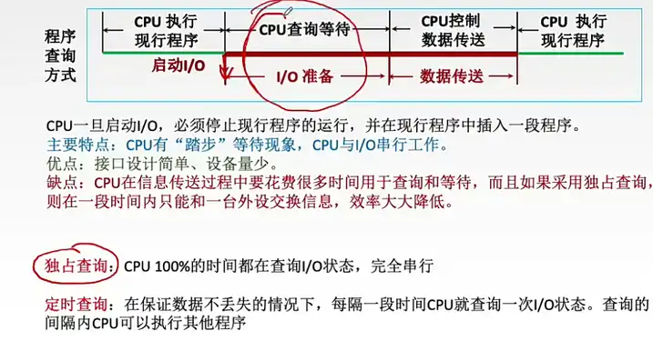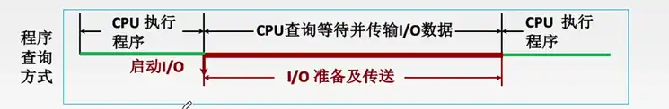 程序查询方式:采用不断轮询的策略,不断的去检测 I/O 控制器中给的 “状态寄存器”,一旦为完成,此时就从数据寄存器中将数据取走。
